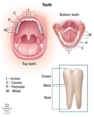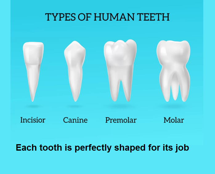 Incisors cut, canines tear, premolars crush, and molars grind—all working together to help us eat efficiently.
