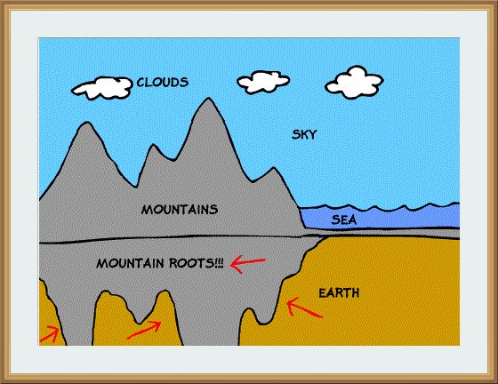 Today, scientists confirm that mountains have deep roots extending into the Earth to stabilize the earth and prevent it from shaking, much like pegs anchoring a tent.
